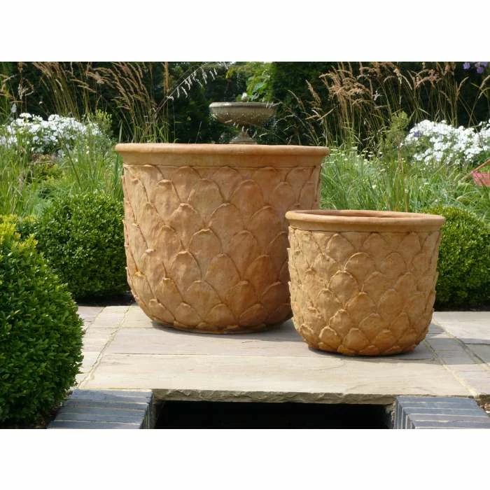 The Pineapple planters are crafted as the name suggests in the form of a pineapple. Their straight sides make them perfect to drop in a significant sized plant with a large root ball. These planters are available in two sizes. The largest size emphasises the advantages of fibreglass, as a terracotta planter of this size would rarely survive a cold frosty winter.